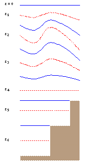 For the hybrid sigma-z coordinate option, we assume that the mixed layer and topography do not intersect. This is not so great, for example, in the Arctic Ocean, but doesn't unduly upset us in our current work. However, we did not want to abandon Dake's vertical mixing parameterization which requires a variable depth mixed layer. So a hybrid vertical structure was implemented - a variable depth mixed layer, patched to a z-coordinate lower ocean by a predetermined division of the intermediate water into sigma layers.| Hybrid coordinate system | ||